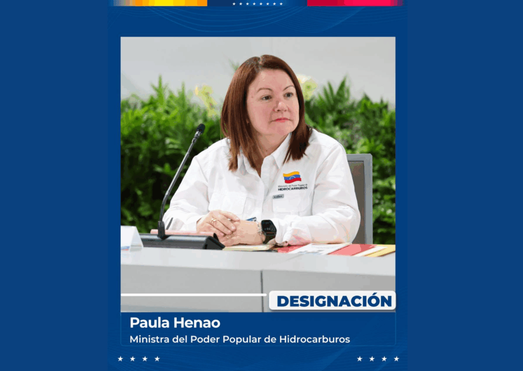 La presidenta Encargada de la República Bolivariana de Venezuela, Delcy Rodríguez, anunció en la noche de este miércoles, a través de su canal oficial de Telegram, la designación de la ingeniera de Petróleo, Paula Henao, como nueva ministra del Poder Popular para Hidrocarburos con la responsabilidad de continuar impulsando el Motor Energético de Venezuela.